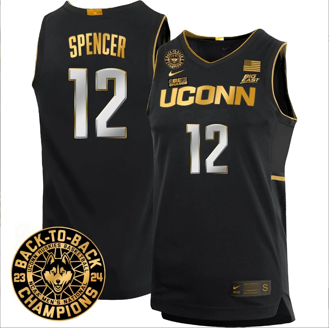 Cam Spencer Jersey #12 UConn Huskies Basketball 2024 Back To Back Champions Patch Black Gold
