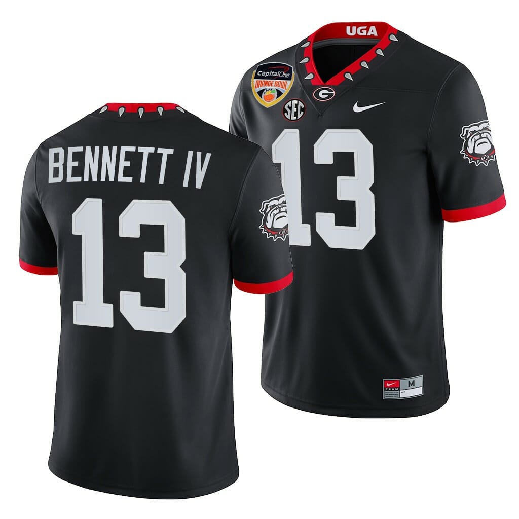 Celebrate your football fandom with this ncaa football jersey ! This Georgia Bulldogs #13 Stetson Bennett 2021 Orange Bowl Black College Football Playoff Jersey is available in various size men, women and youth and features a combination of stitched-embroidery. You’ll look just like your favorite ncaa football players when you rock this ncaa football jersey!