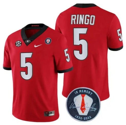 Celebrate your football fandom with this ncaa football jersey ! This Georgia Bulldogs Kelee Ringo #5 Jersey Honoring Vince Dooley Patch Red is available in various size men, women and youth and features a combination of stitched-embroidery. You’ll look just like your favorite ncaa football players when you rock this ncaa football jersey!
