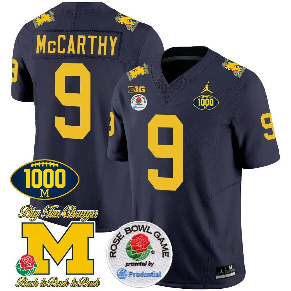 JJ McCarthy Jersey #9 Michigan Wolverines Vapor Stitched 1000 Wins Rose Bowl Patch Navy
