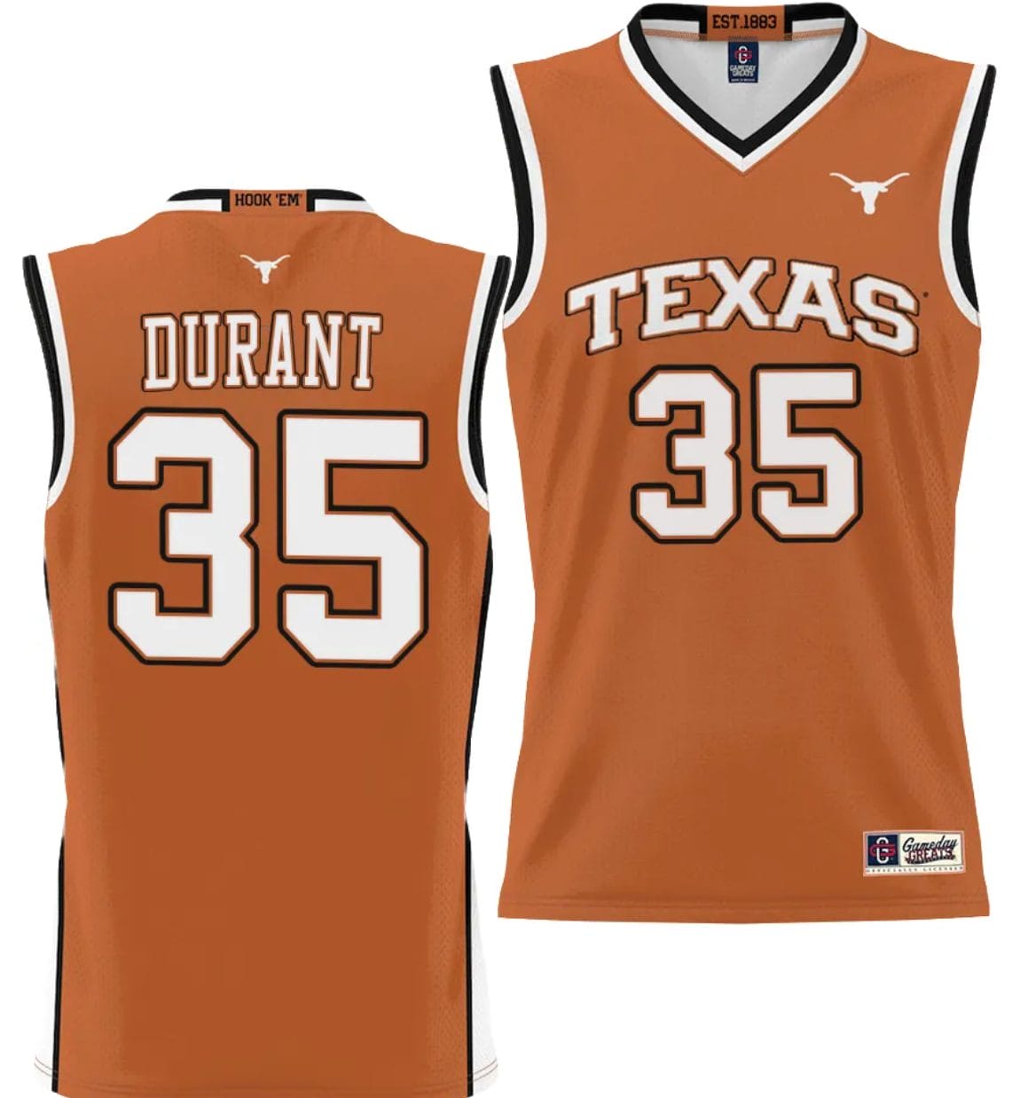 - Material: 100% Polyester Just like the Kevin Durant jersey, Texas Longhorns college basketball jerseys are made from high-quality 100% polyester. This material offers comfort, breathability, and durability.